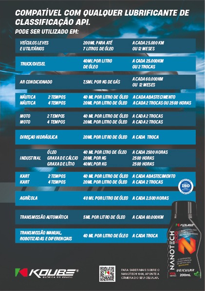 Aplicar 200 mL de Nanotech 1000 Koube em até 7 litros de óleo lubrificante, a cada 25.000 Km ou 12 meses.
